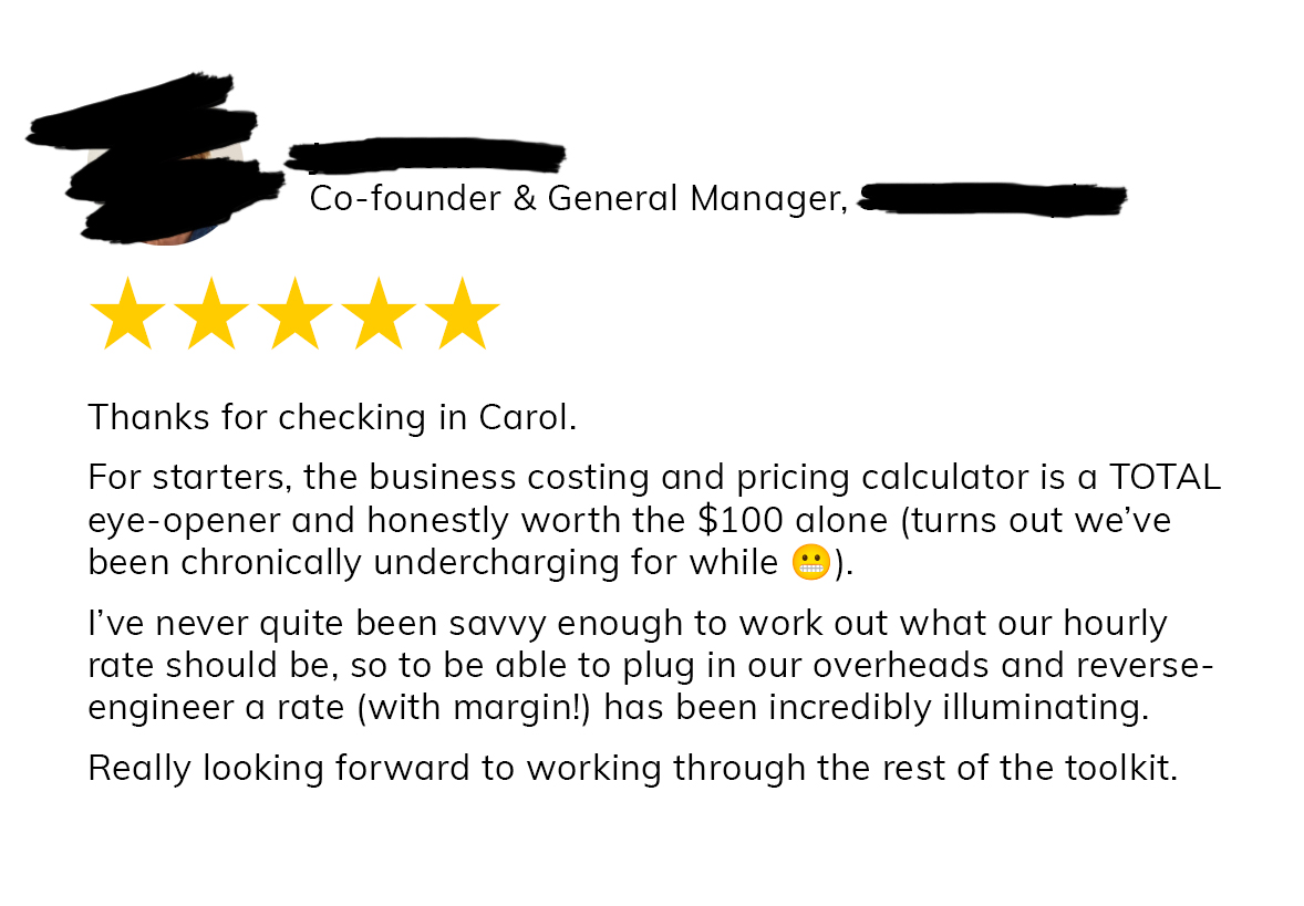 "...to start with, the calculator is a TOTAL eyeopener and honestly worth the $100 alone (turns out we've been chronically undercharging for a while 😫)"